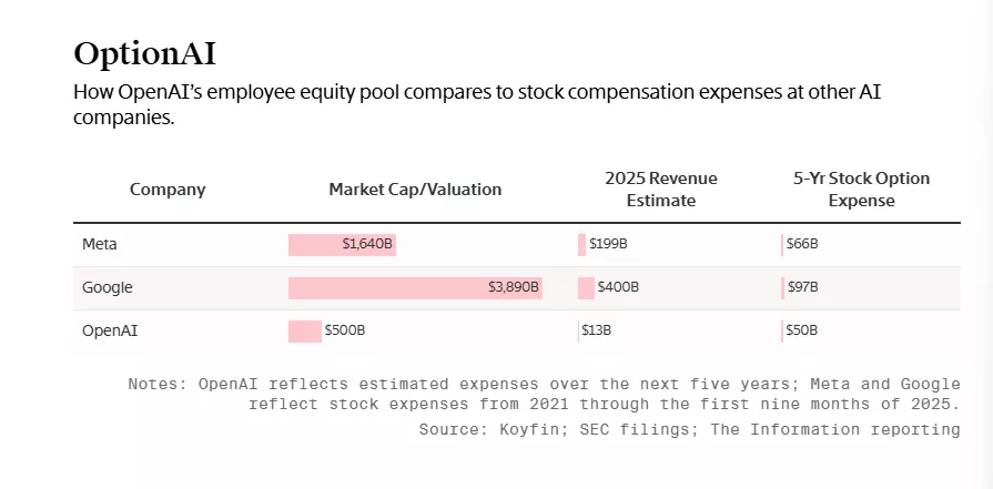图:OpenAI员工股权池与其他AI公司股票薪酬支出方面对比