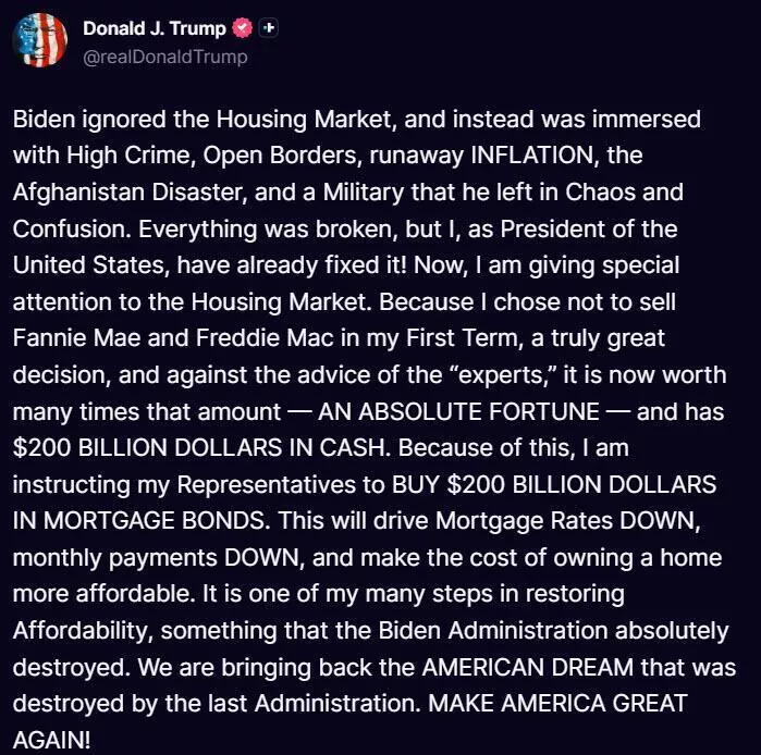 特朗普周四在社交媒体上发文宣布了此举,称“这将推动抵押贷款利率下降、月供减少,并使购房成本更可负担”。