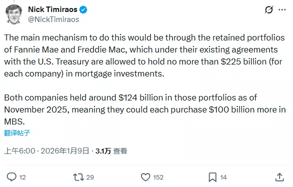素有“新美联储通讯社”之称的著名记者Nick Timiraos表示,特朗普已指示代表购买价值2000亿美元的MBS,实现这一目标的主要机制就是通过房利美和房地美的自留投资组合。根据它们与美国财政部的现有协议,这两家公司各自持有的抵押贷款投资不得超过2250亿美元。而截至2025年11月,两家公司在这些投资组合中各持有约1240亿美元,这意味着它们各自可以再购买1000亿美元的MBS。