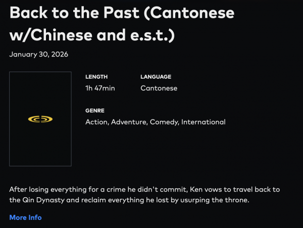 Cineplex官网近日更新《寻秦记》电影资讯页,显示电影将于1月30日、贺岁档期前在加拿大率先上映,本地影迷快将可以入场观赏。