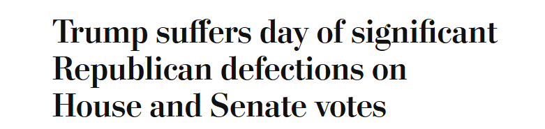 据报道,尽管川普在众议院的另外两项否决投票中幸免于难,但至少有二十多名共和党人在投票中倒向了民主党,作出了违背川普意愿的投票,这表明他们比去年更愿意违抗本党总统的命令。