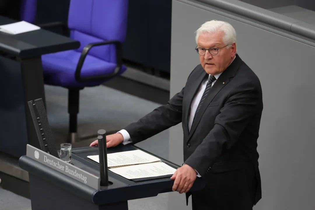 2025年5月8日,德国总统施泰因迈尔在首都柏林国会大厦举行的纪念活动上致辞。 新华社记者杜哲宇摄