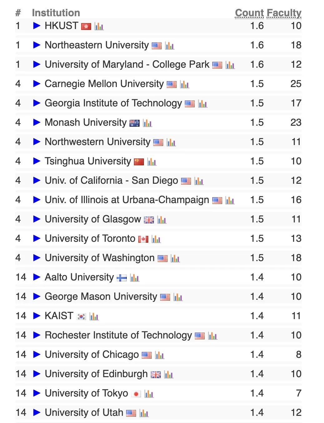 该细分领域的显著特点是“并列排名多”:并列第5的有康奈尔大学、香港科技大学等5所院校,并列第10的多达12所。