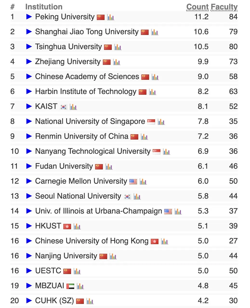 AI作为当前最热门的CS细分方向,2026年榜单呈现“亚洲高校领跑”的格局:全球Top20中,中国大陆高校占据半壁江山,北大、上海交大、清华、浙大、中国科学院大学、哈工大更是包揽前7,学术实力断层领先。美国高校CMU和UIUC上榜,其中CMU位列第13,打破了以往在AI领域的垄断地位。