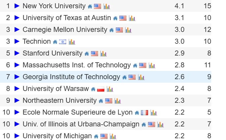 计算机理论研究领域仍是美国高校的“天下”:全球Top10中美国高校占10席,实现“全满贯”,其中NYU拿下世界第一,展现出在理论研究领域的绝对优势。