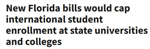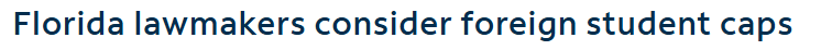 佛罗里达州共和党议员正推动多项新提案,拟收紧非美国公民及部分移民在公立大学的入学资格,其中包括事实上禁止无证移民学生就读州立高校,并对国际学生招生比例设定上限。
