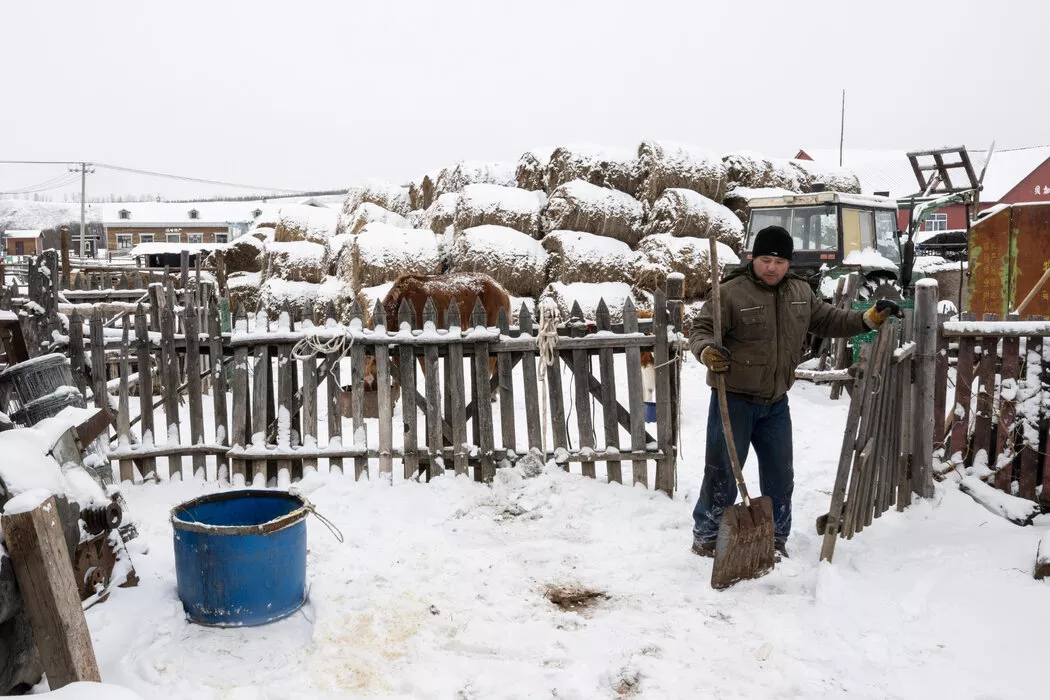 恩和的一名俄罗斯族居民周勇(音)正在马厩前清理积雪,摄于11月。