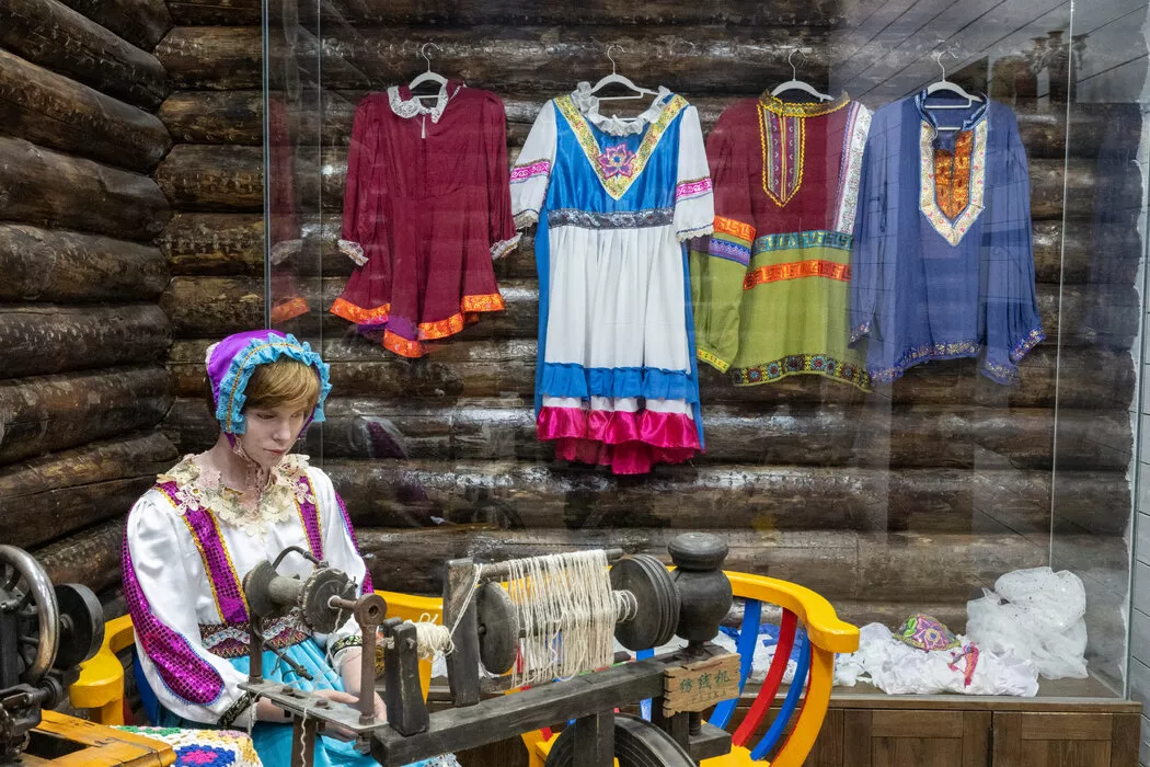 在恩和民俗博物馆内,一名俄罗斯女裁缝的蜡像以及传统俄罗斯服饰。