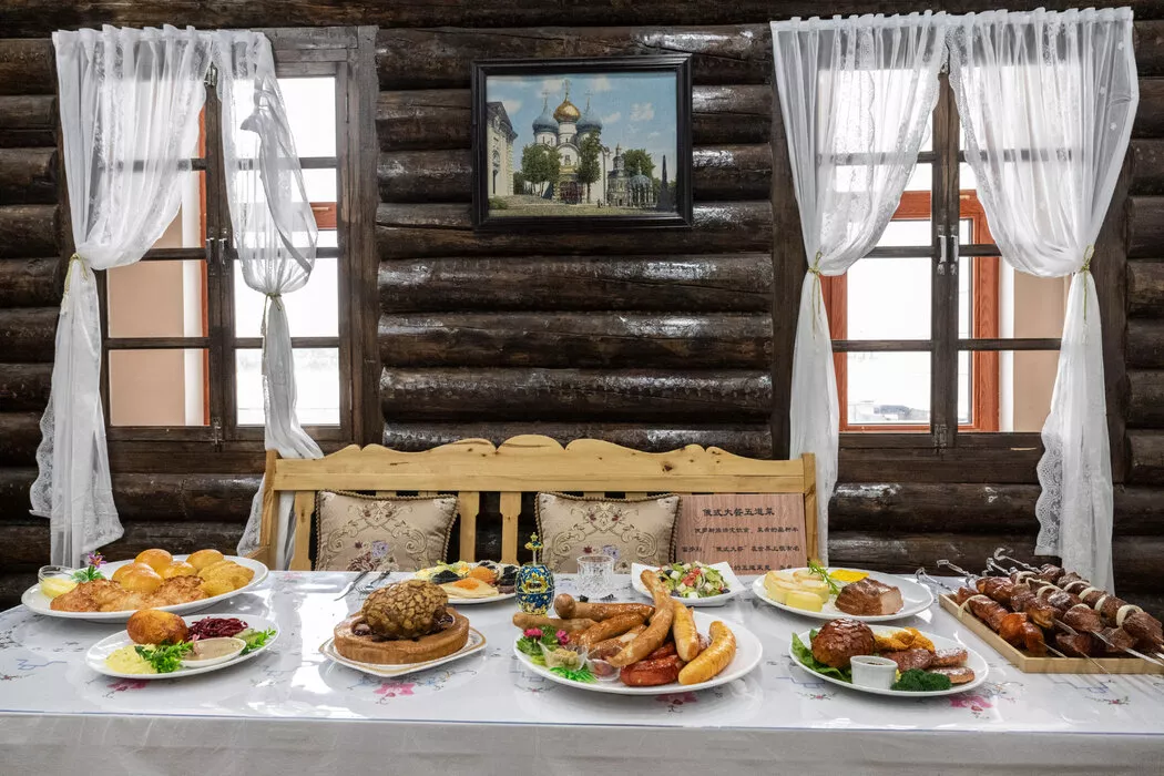 一张大木桌上摆满了“俄罗斯菜”——面包、香肠和烤肉串,但全都是塑料做的。