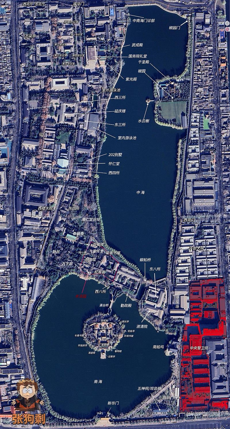过去在卫星地图上仍清晰可见中南海位置与具体设施,如今中国三大地图程式已无法再透过关键字搜寻到中南海。 图:翻摄自 X @Raven__words