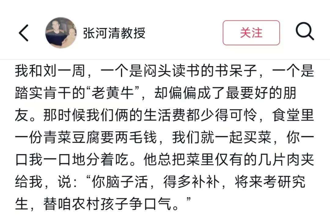 就像张河清教授记忆里的好友刘一周,是大学食堂里,对方总把菜里仅有的几片肉夹过来,说“你脑子活,得多补补”的那份相让;是清贫岁月中,两人合买一份青菜豆腐,你一口我一口分着吃的那份相濡。