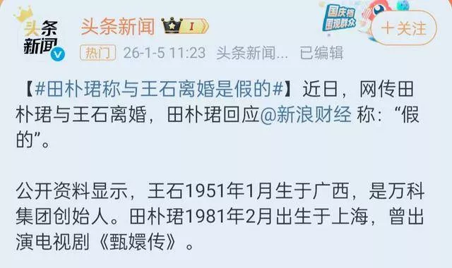 而且田朴珺把某账号里有关王石的动态都删除了,更让人不解,所以离婚传闻甚嚣尘上。