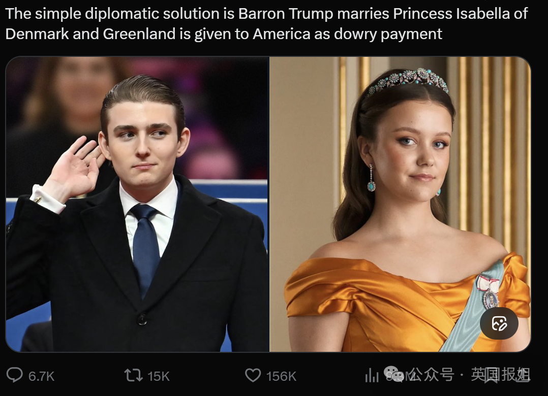 终于,一篇这样的帖子在X上爆火——特朗普有个19岁的儿子,丹麦王室有个18岁的伊莎贝拉公主,不如干脆搞搞“和亲”,把格陵兰岛当成嫁妆送给美国吧。