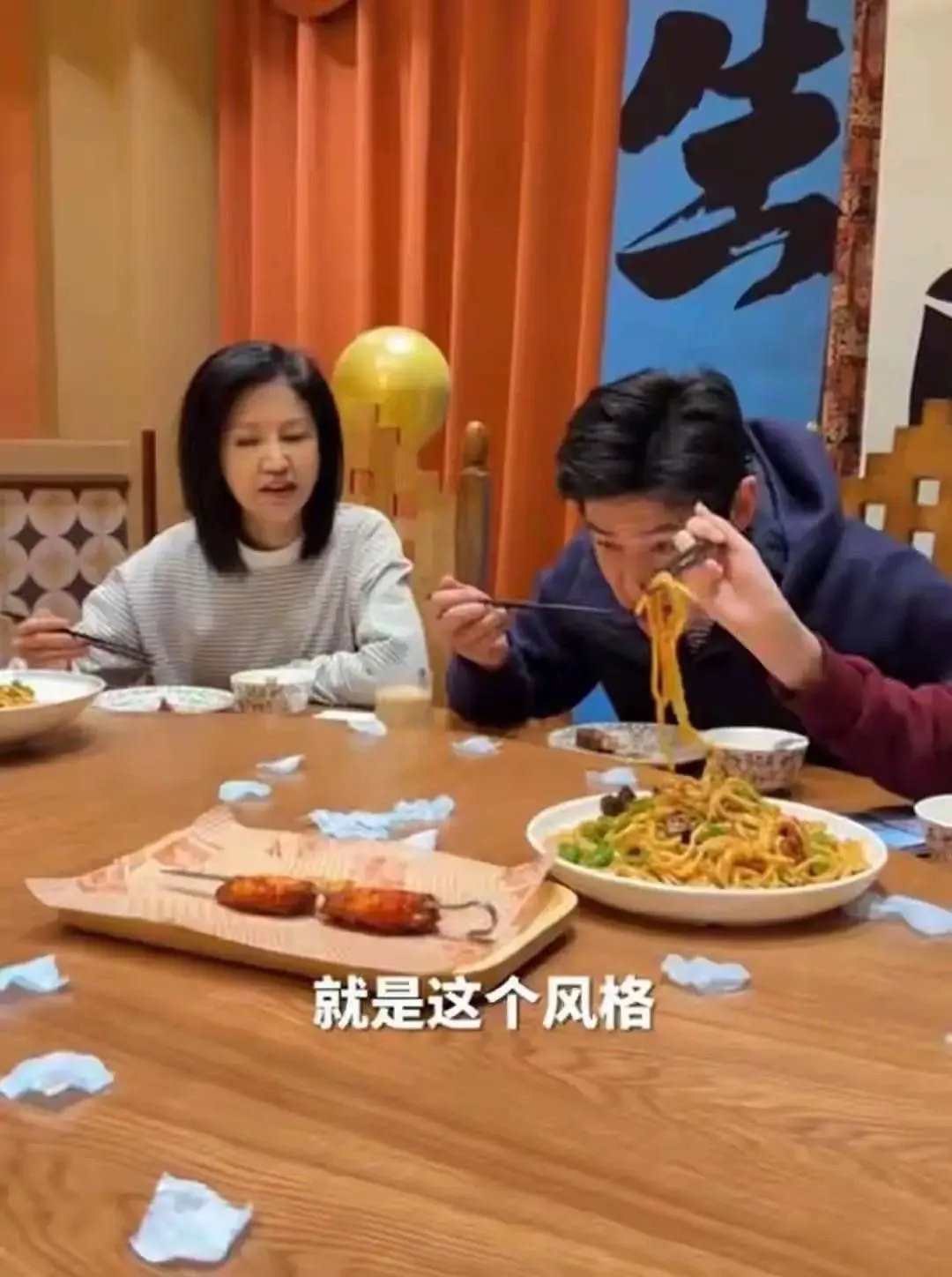 一家四口吃饭,贝儿和小叶子点的餐品不错。看到餐桌上只有一碗炒面、然后一串鸡翅膀,陆毅低头吃着什么嚼不动的东西,感觉很吃力。