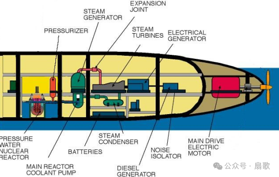 核动力反应堆产生的热量是通过水带出来,在一般反应堆中冷却水是靠泵打进去的,要用2到4套离心水泵进行,反应堆功率大一点的流量每个小时都要上千吨,这就比如带来巨大的机械和流体噪声,而且随着泵体长时间运作带来机械磨损,也会让噪声越来越大,