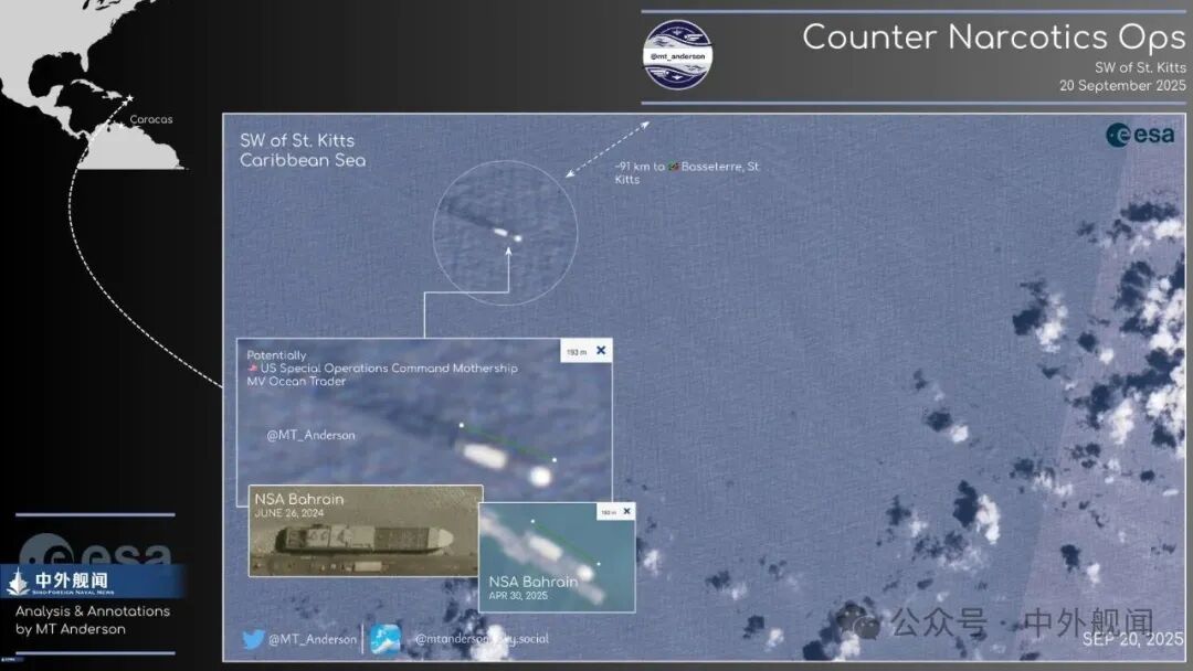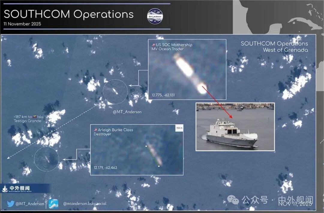 其中一条重要线索就是一艘神秘舰船的出没——“海洋贸易者”号特种作战伪装支援母舰(MV Ocean Trader)。该舰接受美国特种作战司令部(USSOCOM)指挥,在9月份“南方之矛行动”之初由美国海军舰艇包打加勒比的时候,该舰就被发现在加勒比海出没,在委内瑞拉北600公里左右的英属维尔京群岛附近海域航行,此后一直在该地区徘徊。直到“绝对决心行动”爆发前的1月3日,该舰被发现出现在距离委内瑞拉不到200公里的外海,正式进入作战阵位。