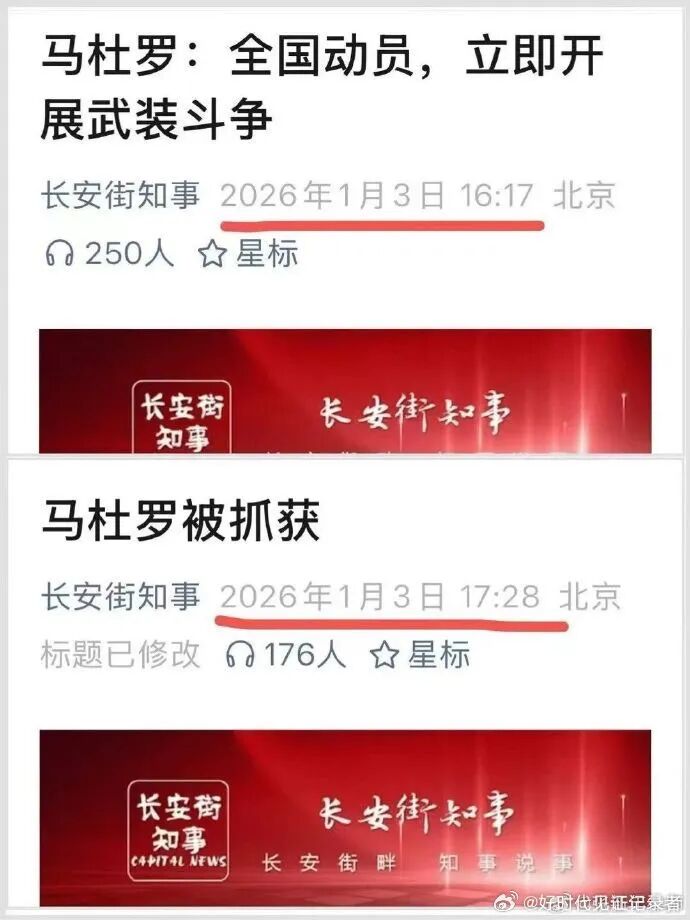 七十一分钟的武装斗争:长安街知事是党媒《北京日报》的网络喉舌。刚意淫了一个马杜罗动员武装斗争的新闻,就不得不报道马杜罗被活捉的消息。马杜罗的武装斗争只持续了七十一分钟。据报道,马杜罗是在睡觉时被捉的,也许他在梦中发出了武装斗争的动员令?