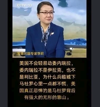 马杜罗为何不慌:中国国防大学教授李莉在央视节目中评论:面对美国军事威胁,马杜罗为何不慌?因为委内瑞拉有靠山和S-300防空系统,美国就不敢轻举妄动。央视夸赞她凭一张嘴就让美军胆寒。李莉是著名的夸谁谁垮。她的著名论断有“伊朗能半小时干掉以色列”。萨达姆、巴沙尔,哈梅内伊等独裁者都被中共媒体的不慌论捧过后纷纷倒台。现在“为啥不慌”已经成为捧谁谁完的网络梗了。有如此军事专家,中国自称的所谓军事强国到底如何?可想而知。