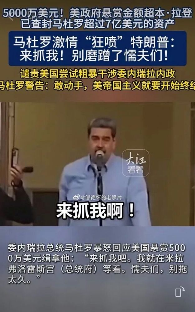 不要轻易许愿:美国宣布对马杜罗的5000万美元悬赏金后,马杜罗去年8月公开呛声,“来抓我啊!我会在总统府等你。胆小鬼们,别让老子等太久”。4个月不算太久,马杜罗求仁得仁,求囚得囚。他也许是2026年第一个心想事成的人。