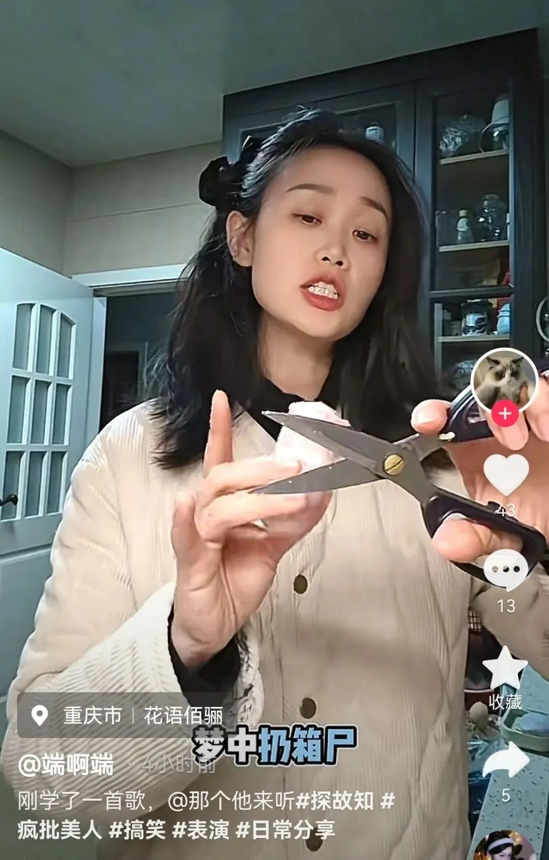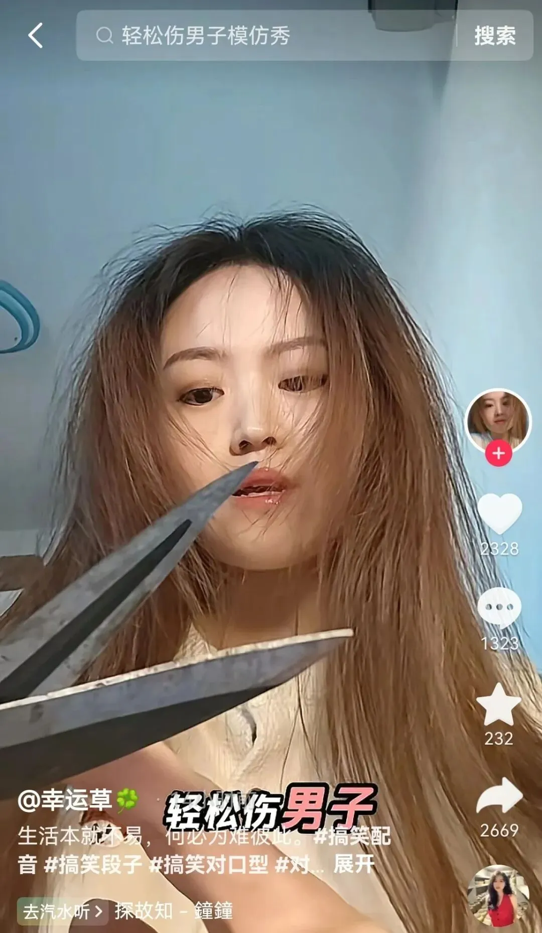一个个披头散发,磨皮开得能反光、瘦脸拉到变形都遮不住五官硬伤的女的,杵在镜头前,手里攥着把剪刀来回摩挲。
