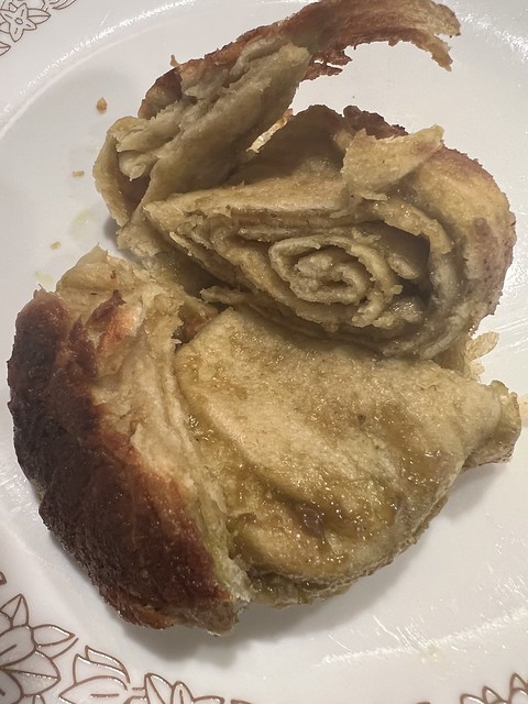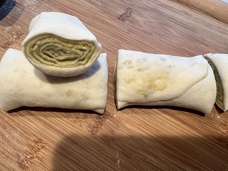 圈起来切段。我没敢想上面链接方子那样多折一折,因为怕糖酱流出来。就这样两面收口捏紧就好。