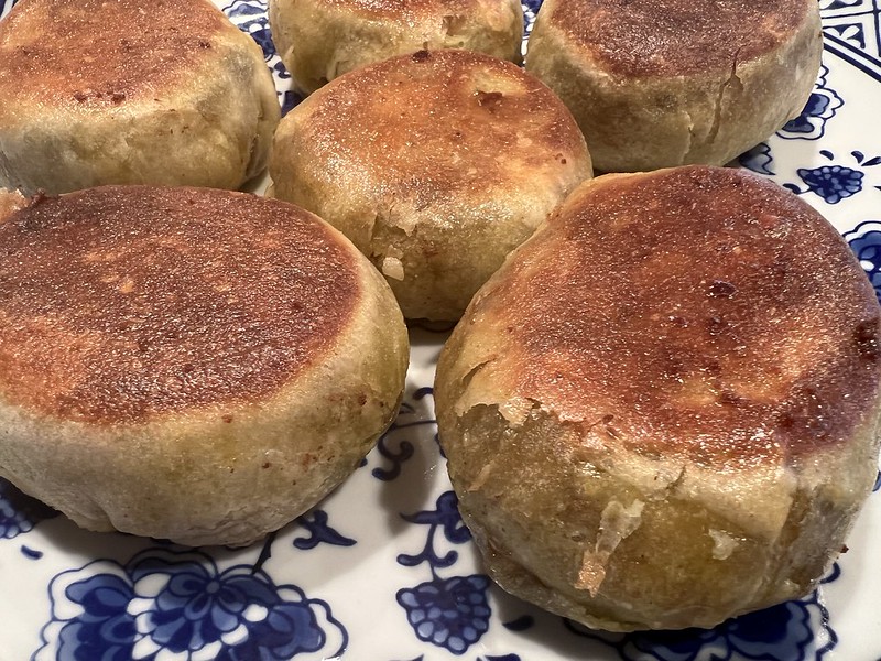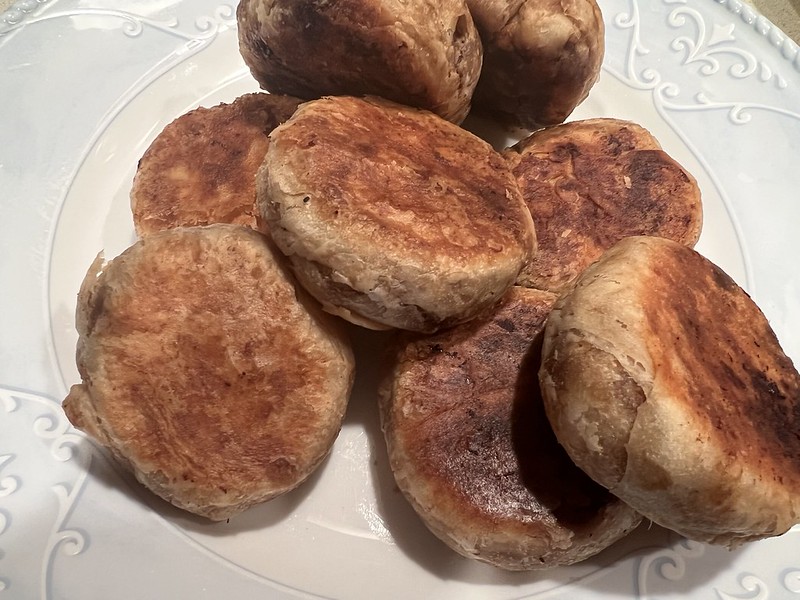 烙饼也是照着以前写的方子。中火,定型后两面勤翻着点。盖着盖子烙。