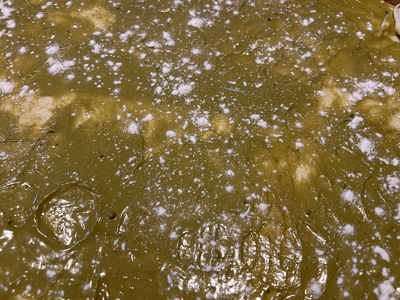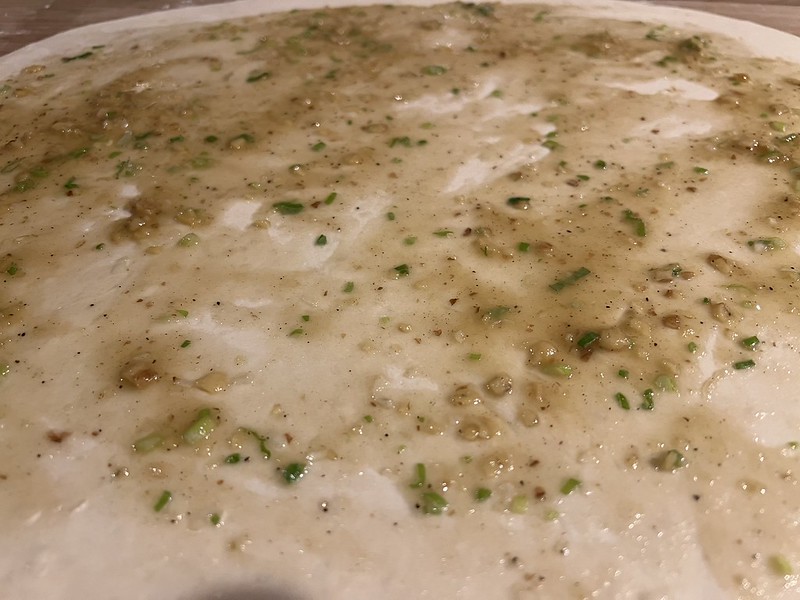 Costco买的开心果酱比较甜也比较稀。我把酱抹平后又撒上点面粉。下次也许往酱里面加些面粉。不然会流出来,不好收口。