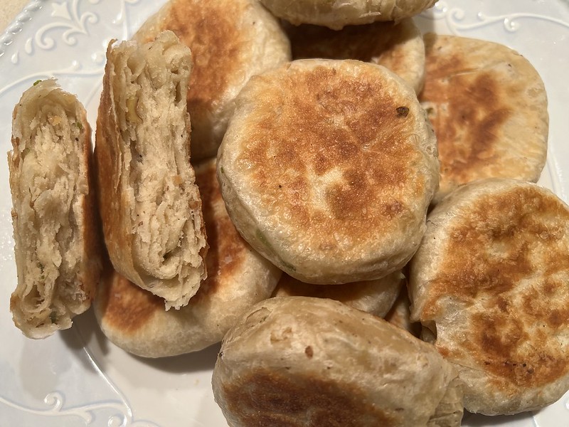 这锅是咸口的油酥烧饼。里面夹上酱牛肉特别好吃。看看层次还不错吧。