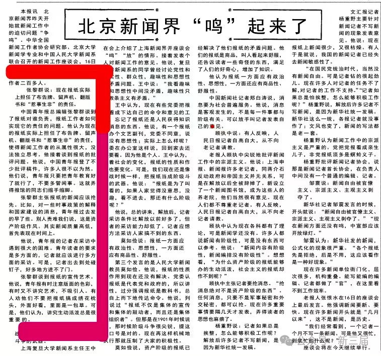 1957年5月17日《人民日报》1版刊登首都新闻界开会“鸣放”消息。红框中是张黎群的发言内容