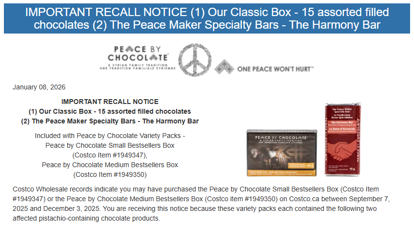 Peace by Chocolate解释,本次召回涉及含开心果的部分巧克力产品,是自愿行为。原因是该公司的一家原料供应商Tootsi Impex Inc.因一批开心果可能受沙门氏菌(Salmonella)污染而主动召回。其他巧克力混合礼盒中的产品不在召回范围内。