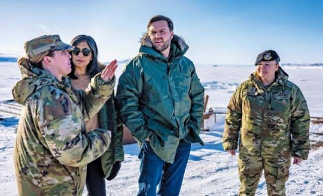 美联社报道称,去年3月访问格陵兰的美国副总统JD・万斯(右二)及其夫人乌莎・万斯(左二)在士兵的陪同下参观了美军皮图菲克太空基地。
