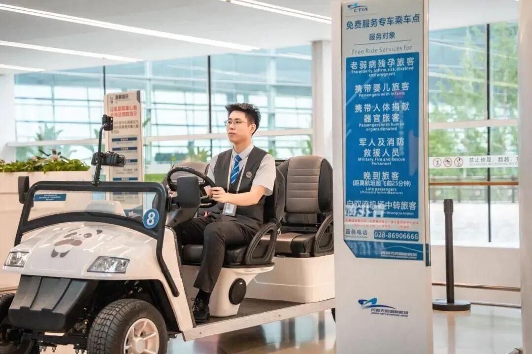 免费服务专车:经过安检后,老年旅客还可以乘坐免费服务专车,工作人员将平稳地将旅客送往登机口。