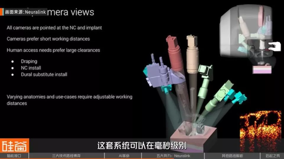 为了做到这一点,Neuralink用了6套显微镜加上OCT扫描技术,组成了一个超级精密的“眼睛”。这套系统可以在毫秒级别追踪大脑组织的运动,提前预判路径,精准避开所有血管。