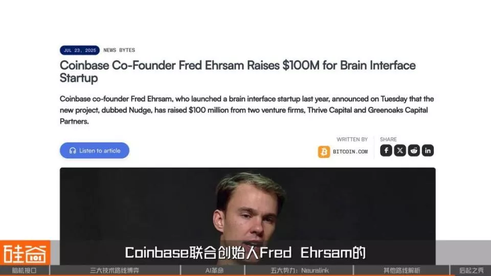 同期,Coinbase联合创始人Fred Ehrsam的非侵入式脑接口公司Nudge宣布完成1亿美元A轮;另一个采用超声BCI的项目Forest Neurotech获得前Google CEO Eric Schmidt的1400万美元资助,目标是用超声在不开颅、无需脑内植入电极的前提下感知与调控大脑活动。