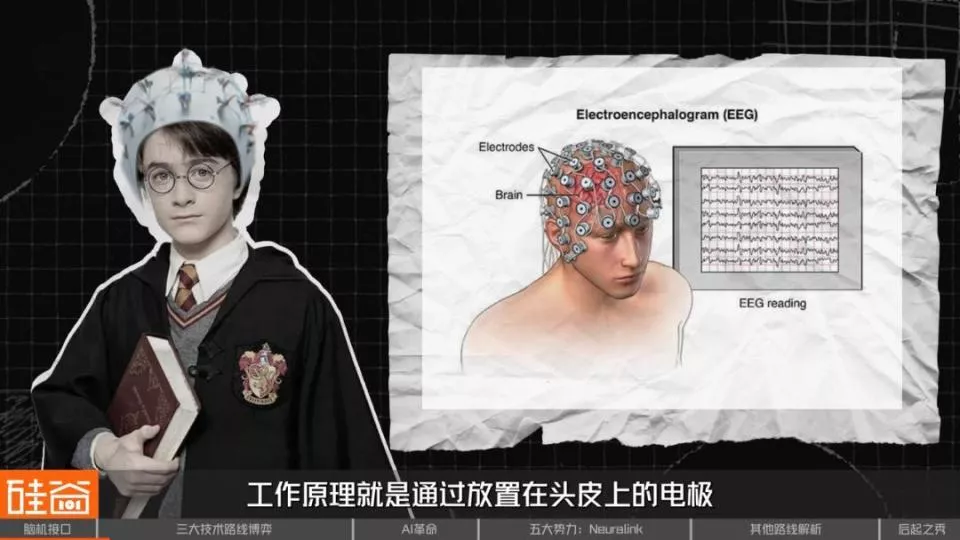 第一类就是非侵入式:好处是最安全,但坏处是信号最弱。这类设备就像一顶“读心帽”,戴在头上就能用,工作原理就是通过放置在头皮上的电极,检测大脑活动产生的微弱电信号。