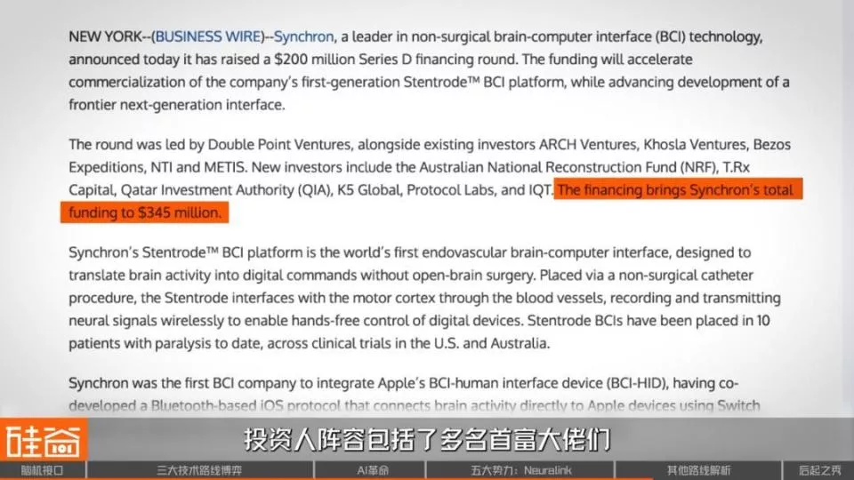 截至2025年,Synchron已完成了多位患者的植入测试,累计融资约3.45亿美元,投资人阵容包括多名首富大佬,比如贝佐斯家族基金、盖茨基金会等。
