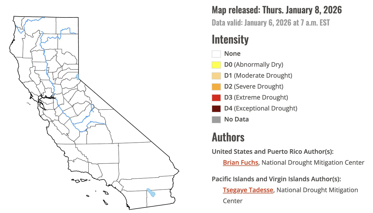 2026年1月8日的干旱状态为一片白,这也意味着整个加州脱离干旱,是加州25年来首次完全没有任何干旱区域的「零干旱」时刻。(美国干旱监测官网截图)