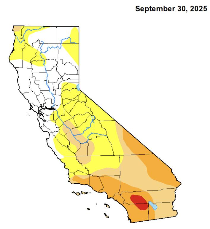 美国干旱监测(U.S. Drought Monitor)网站显示加州在2025年9月30日的干旱状态,当时南加州多数地区仍有干旱问题存在。(美国干旱监测官网截图)