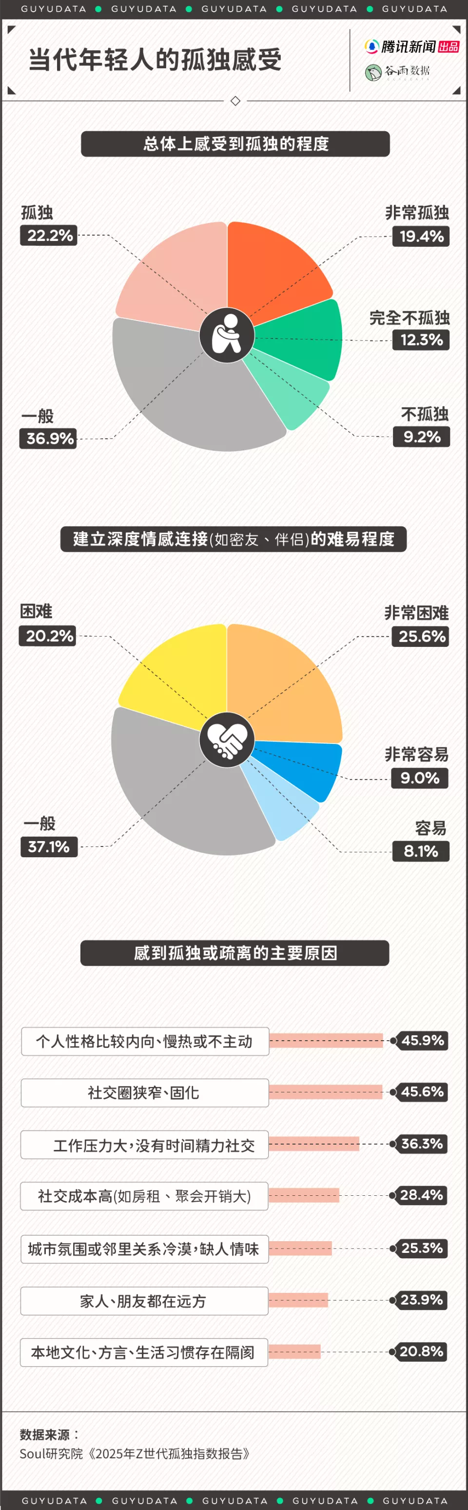 《2025年Z世代孤独指数报告》显示,41.6%的年轻人感到“孤独”或“非常孤独”,45.8%的年轻人对于建立深度情感连接(如密友、伴侣)感到“困难”或“非常困难”。导致年轻人感到孤独或疏离的前三大原因分别是:内向的性格、狭窄的社交圈、工作的压力。
