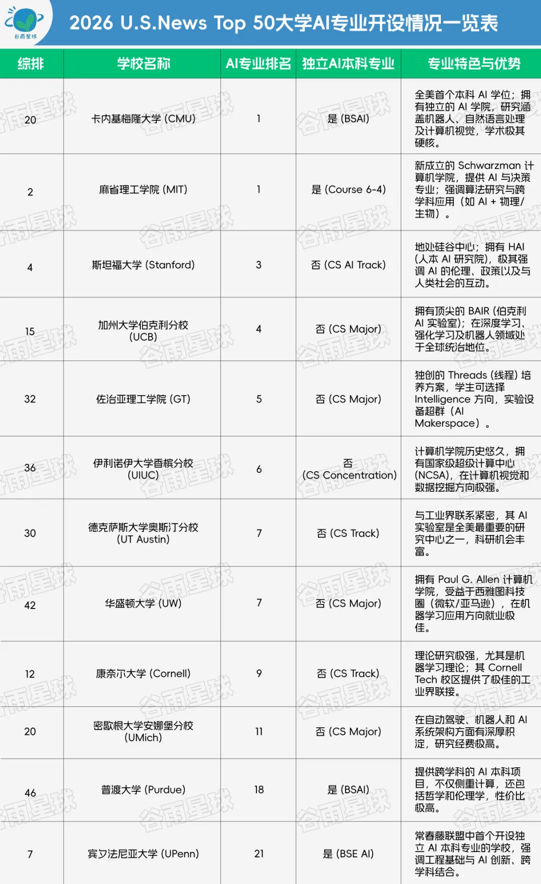 在U.S.News排名前50的大学里,超过10所已经有了AI专业或者AI方向。