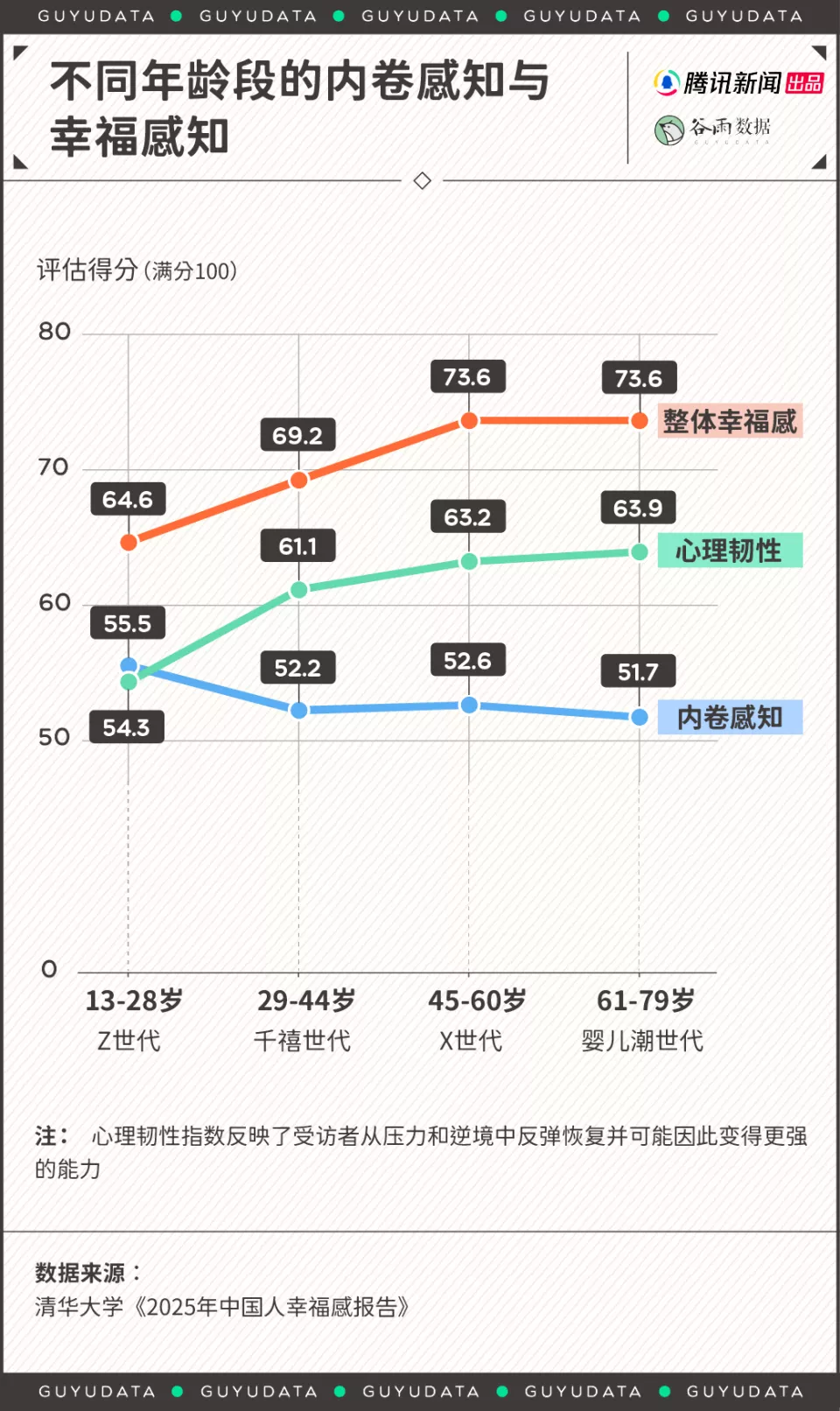 清华大学发布的《2025年中国人幸福感报告》显示,13-28岁的群体是内卷感知最强烈而整体幸福感相对偏低的一代人。该报告对此解释到,随着年龄的增长,个体认知更成熟,年轻人的心理韧性逐渐变强,内卷感知会更弱,而幸福感会提高。