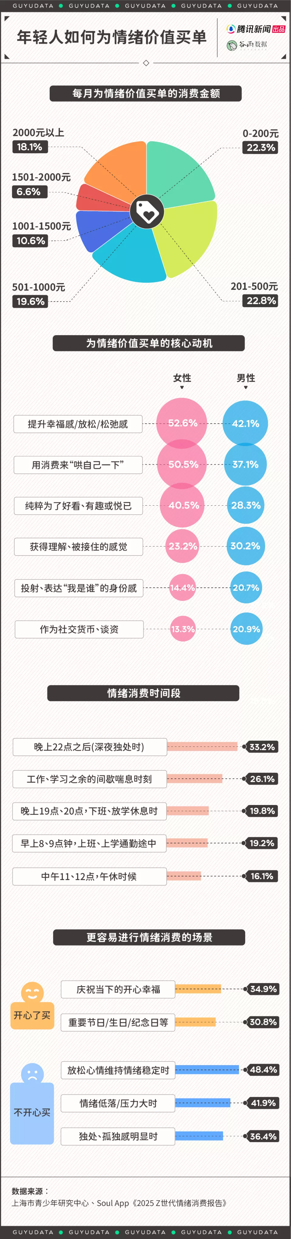 《2025 Z世代情绪消费报告》显示,近9成青年有过“为情绪价值买单”的经历,月均情绪消费支出为949元,18.1%的人每月情绪消费超过2000元。女性更倾向用情绪消费来“哄自己一下”,而男性更渴望通过消费获得理解与认可。