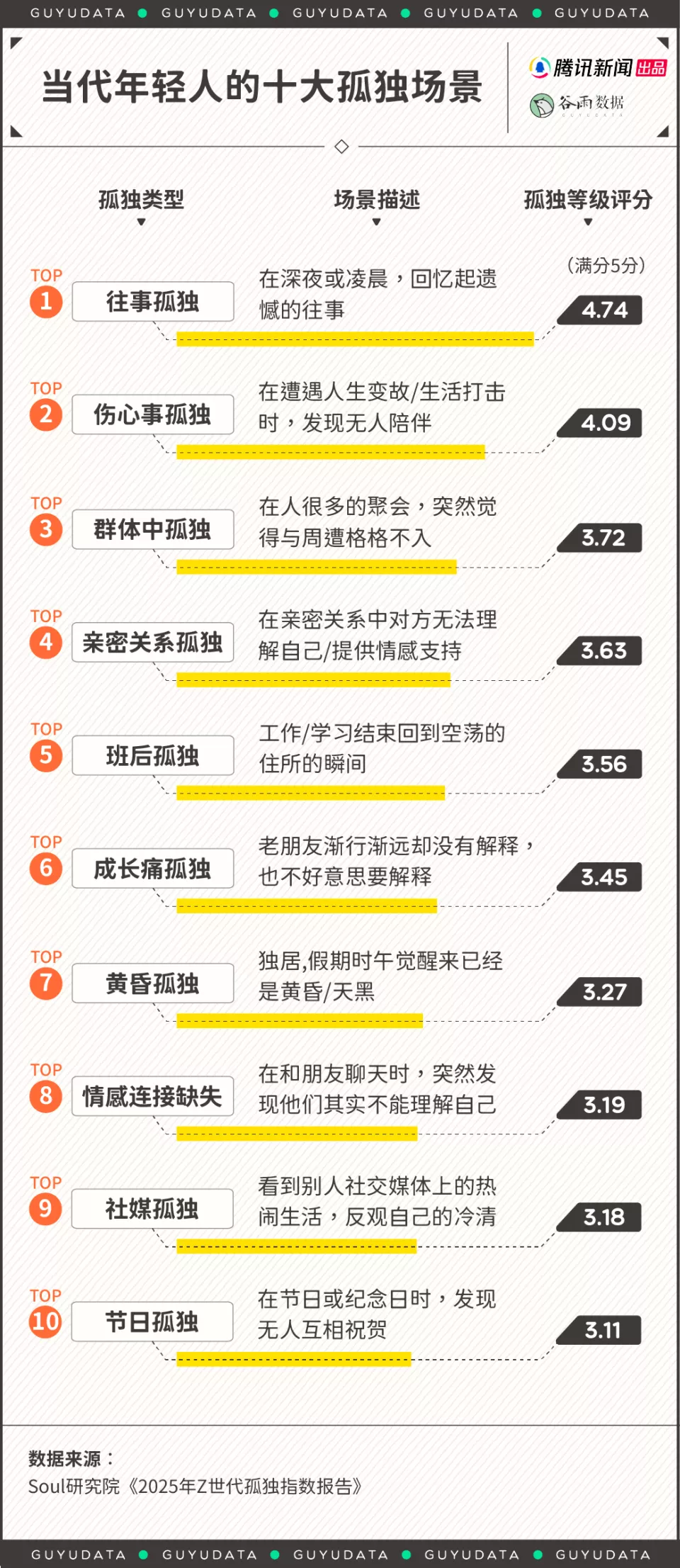 在该报告列举的十大孤独情境中,“在聚会中格格不入”“下班后回到空荡的住所”“社交媒体上的热闹反衬自己的冷清”等属于社会学中“群体性孤独”的体现。