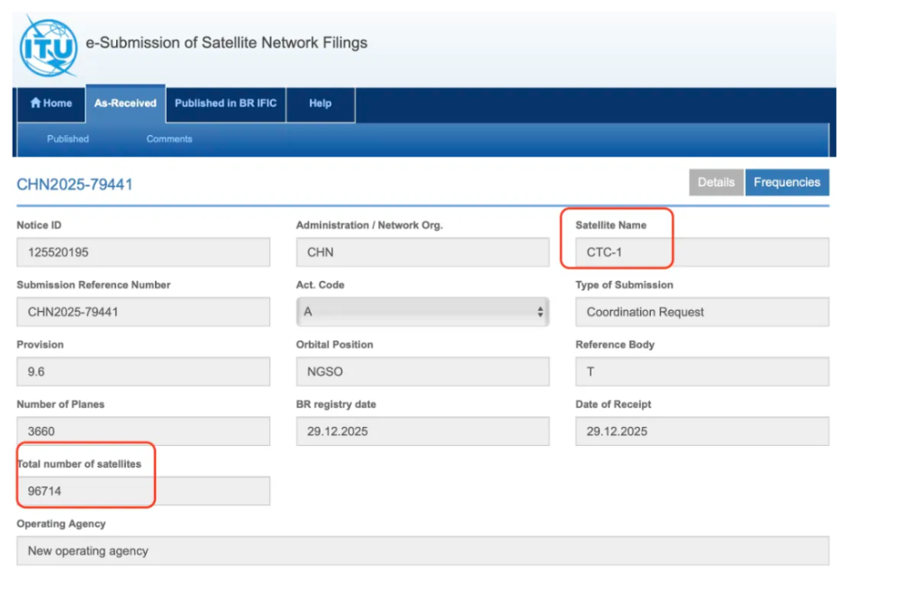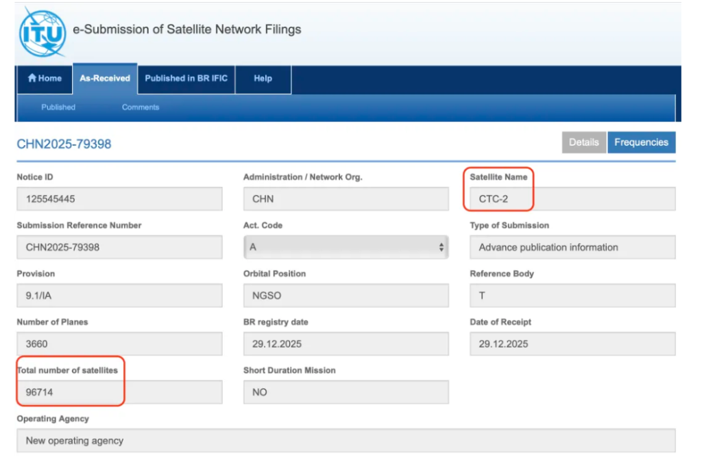 记者查询国际电信联盟(ITU)官网获悉,我国2025年12月向ITU申请了超20万颗卫星的频轨资源。
