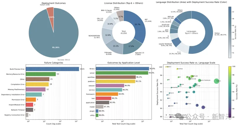 通过这一多阶段漏斗流程,他们将最初约50万个仓库,收敛为52,550个进入自动部署流程的科学工具候选。