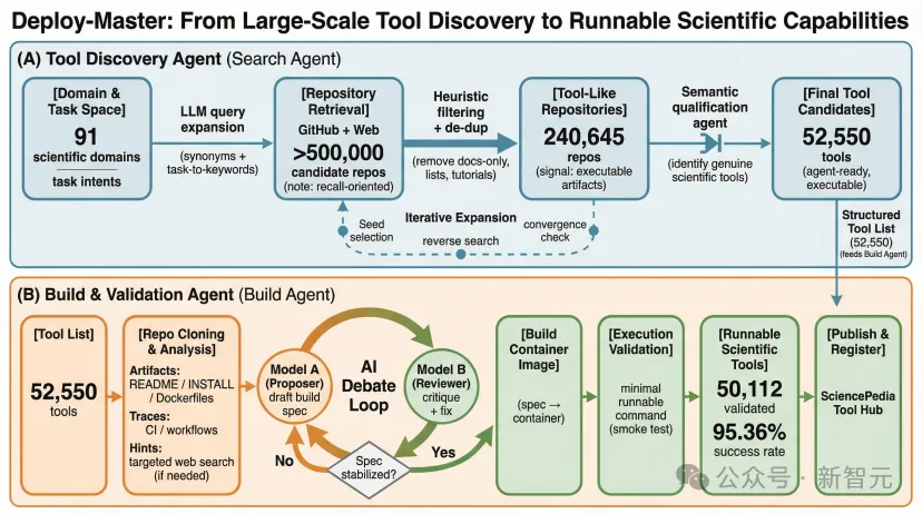 随后,他们通过结构启发式规则剔除明显不可执行的仓库,并由agent进行语义判断,确认其是否构成一个可执行科学工具。