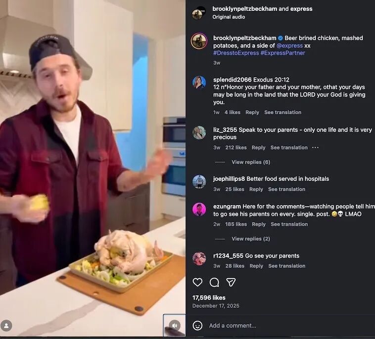 去年12月,母亲维多利亚给布鲁克林发出的一条做啤酒鸡的视频点了赞,成了彻底引爆矛盾的导火索。