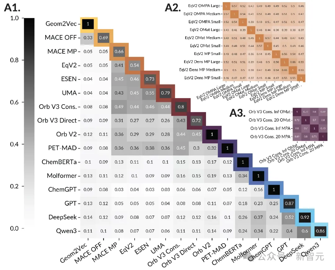 跨架构的表征对齐:矩阵中的深色区域显示了Orb V3等高性能模型与其它严谨物理模型(如MACE、EqV2)之间强烈的共鸣。