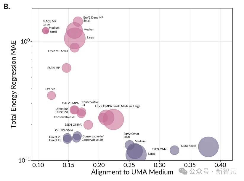 性能与认知的同步:能量预测越精准,模型与顶尖基座的思维方式就越趋同。每个点代表一个模型;点大小对应模型大小。