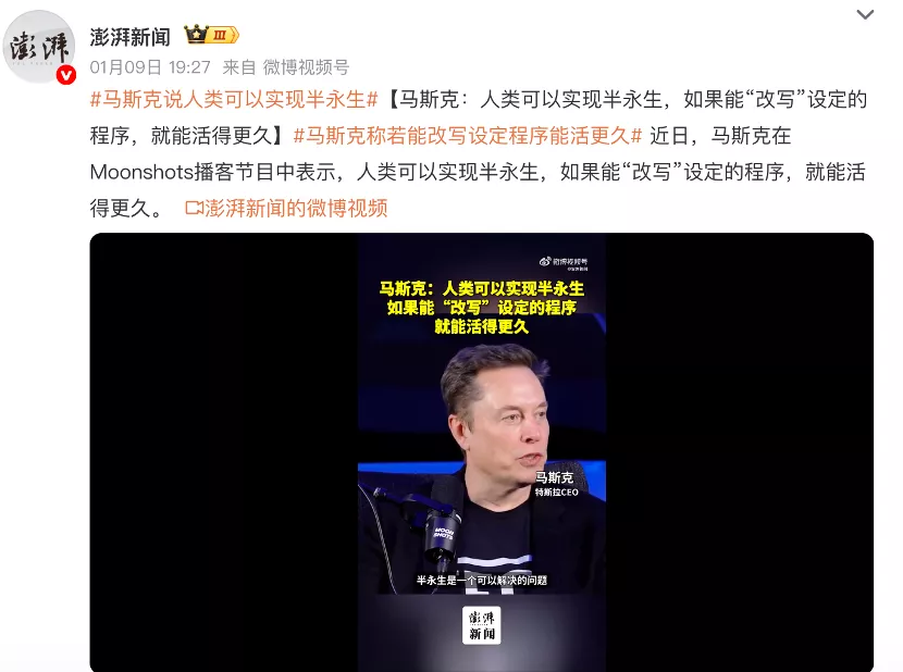 1月10日消息,近日,马斯克在Moonshots播客节目中表示,人类可以实现半永生,如果能“改写”设定的程序,就能活得更久。